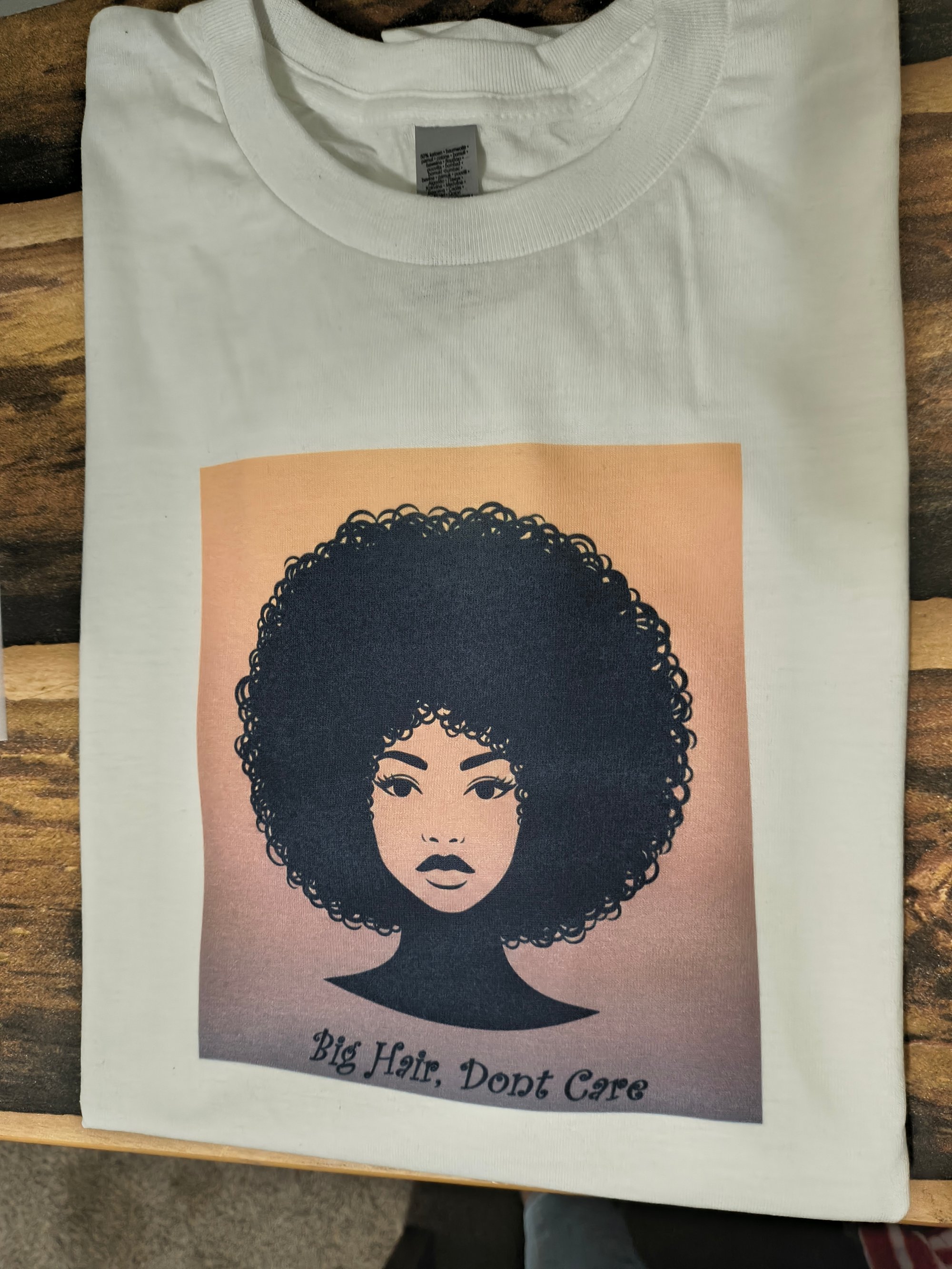 Big hair dont care sublimated tshirt. 50/50 cotton polyester blend. Size large available in white.