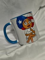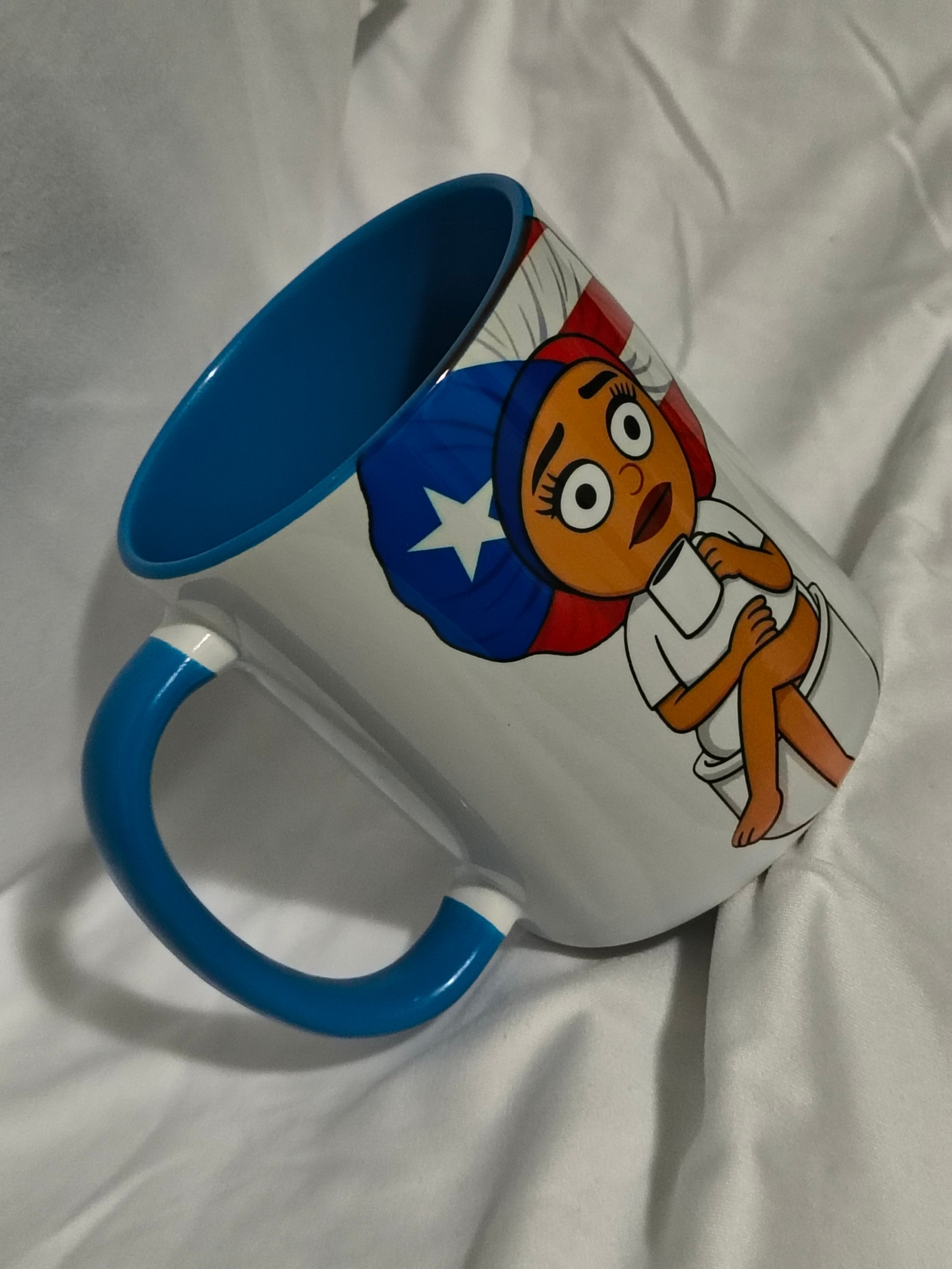 Puerto Rican girl drinking coffee with bonnet. Blue handle and blue inside. 11oz mug
