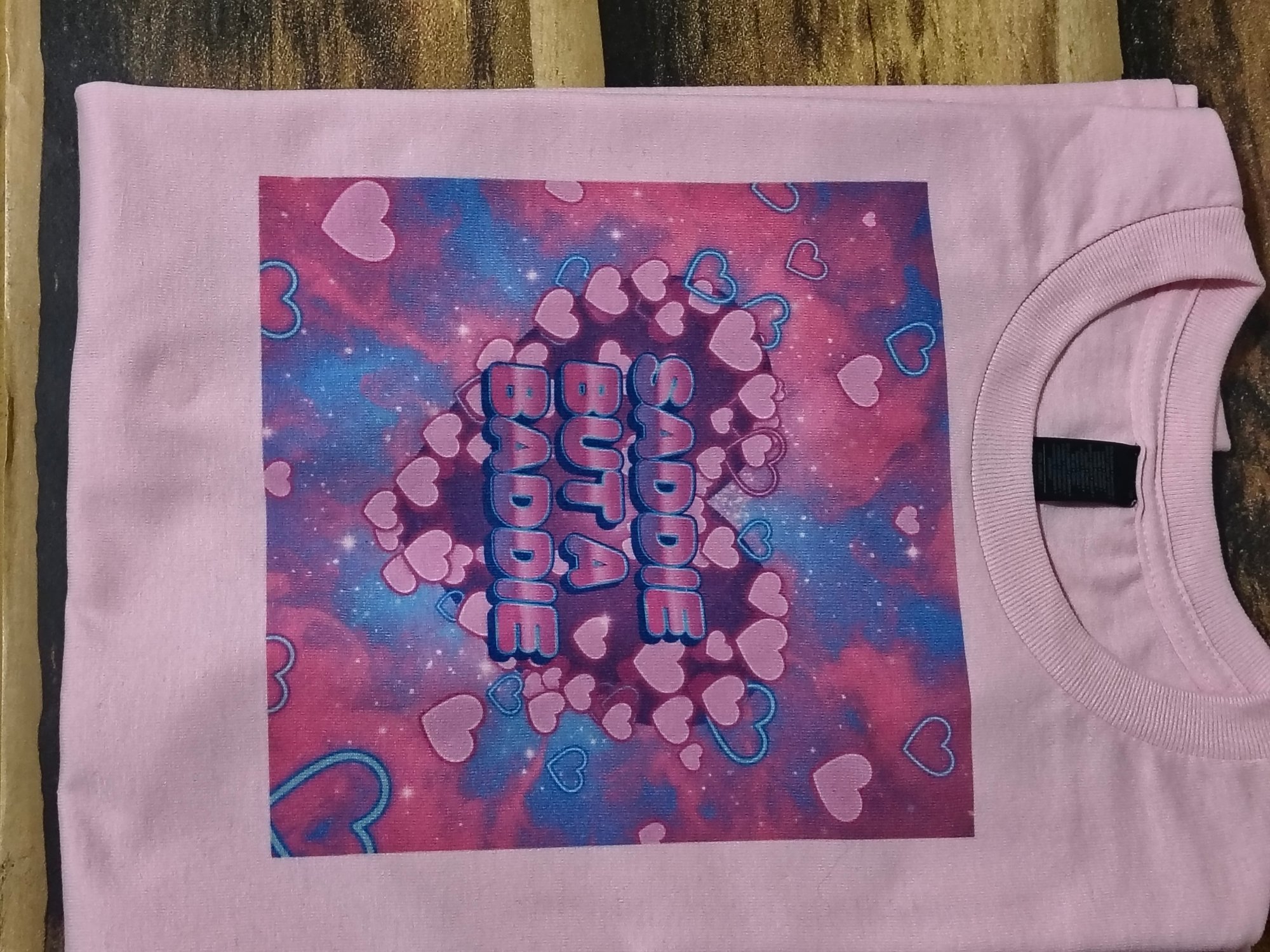 Saddie But A Baddie sublimation shirt. Size medium in pink. 50/50 cotton polyester blend